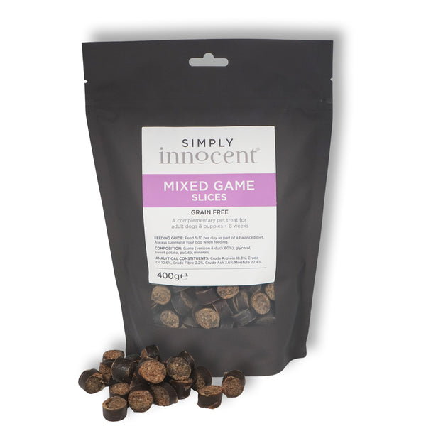 Air-dried game sausages or slices made with 60% British meat (venison & duck). Grain free.