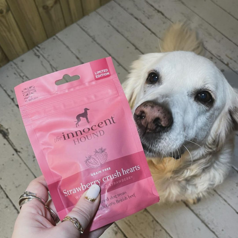 Our delicious heart-shaped treats with 60% British beef and strawberries. Perfect treats to show your dog how much you love them.